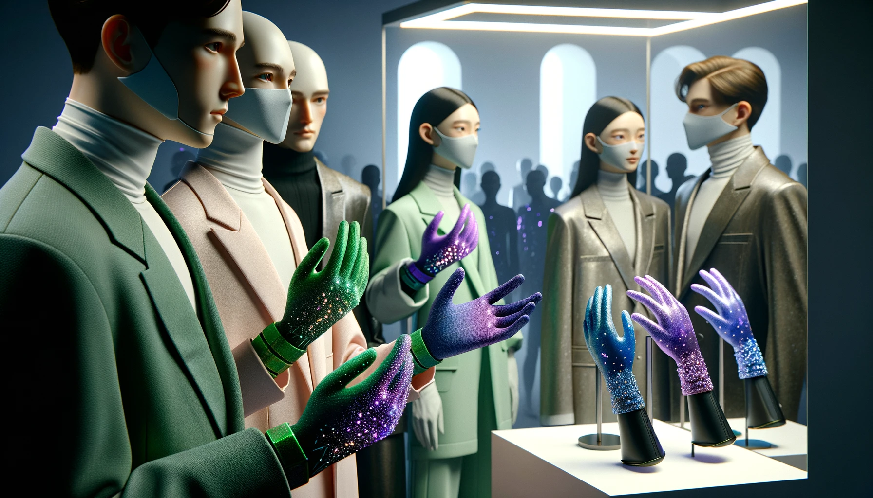 To help illustrate the points made above we asked Chat GPT to create some images-knowing their weak points we prompted "Can you create an image of four people modeling green and blue gloves with purple sparkles?" This prompt, while vague asks for several specific items and requests hands to be visible, a known weak point in the AI's capabilities. The program provided three images to choose from in three different styles-see below. Now, on first glance-we were impressed, the program is continually getting better and better at generating hands-but there are still flaws. Use the tips above to spot them and comment when you find them.